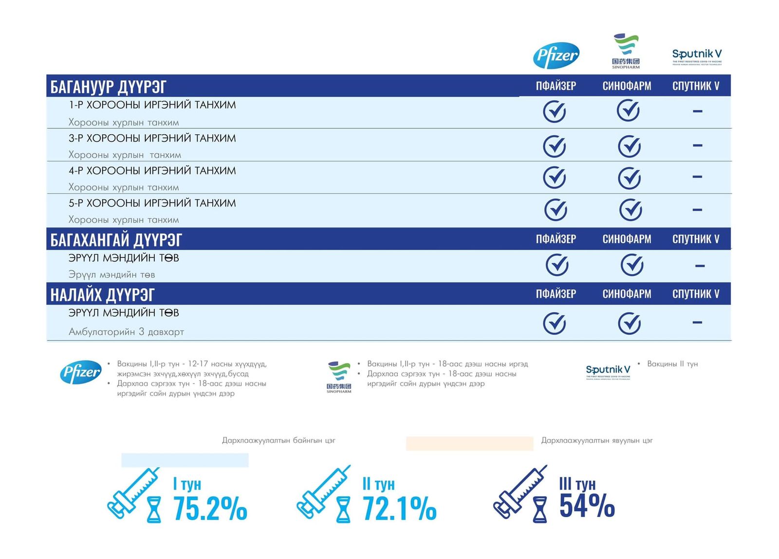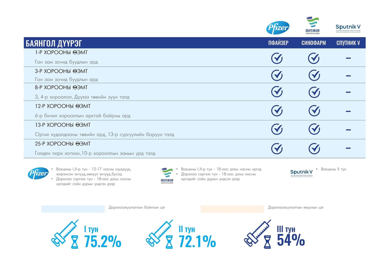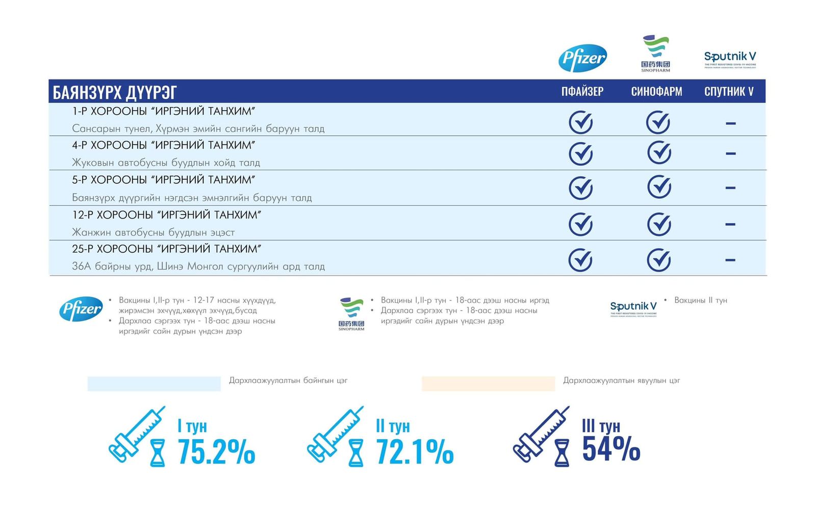 Вакцинжуулалт эхэлснээс хойш нийслэлийн зорилтот хүн амын I тунгийн хамралт 75.2 хувь, II тунгийн хамралт 72.1 хувь, III тунгийн хамралт 54 хувь, нэмэлт IV тунгийн хамрагдалт 6.8 хувь байна.