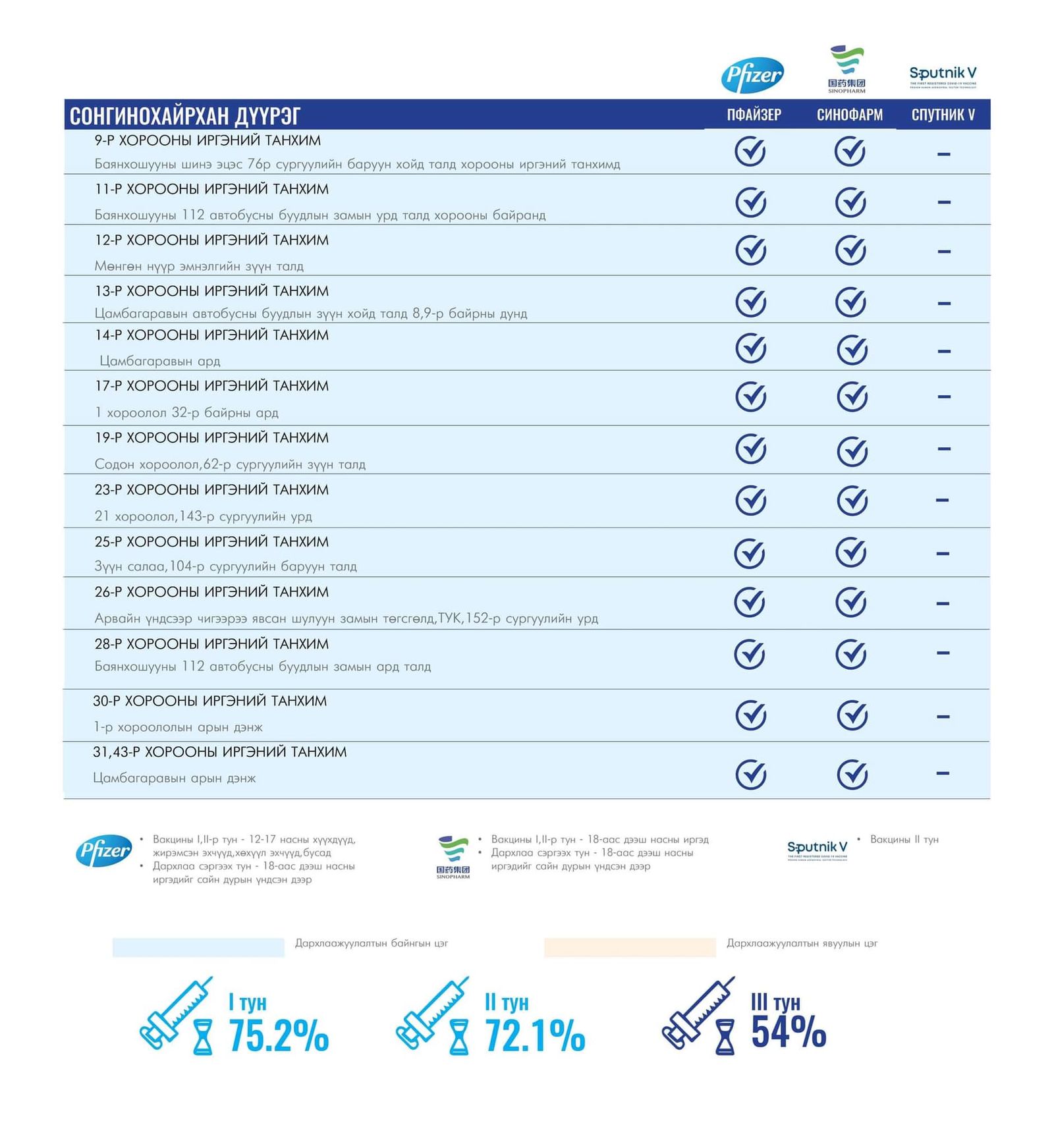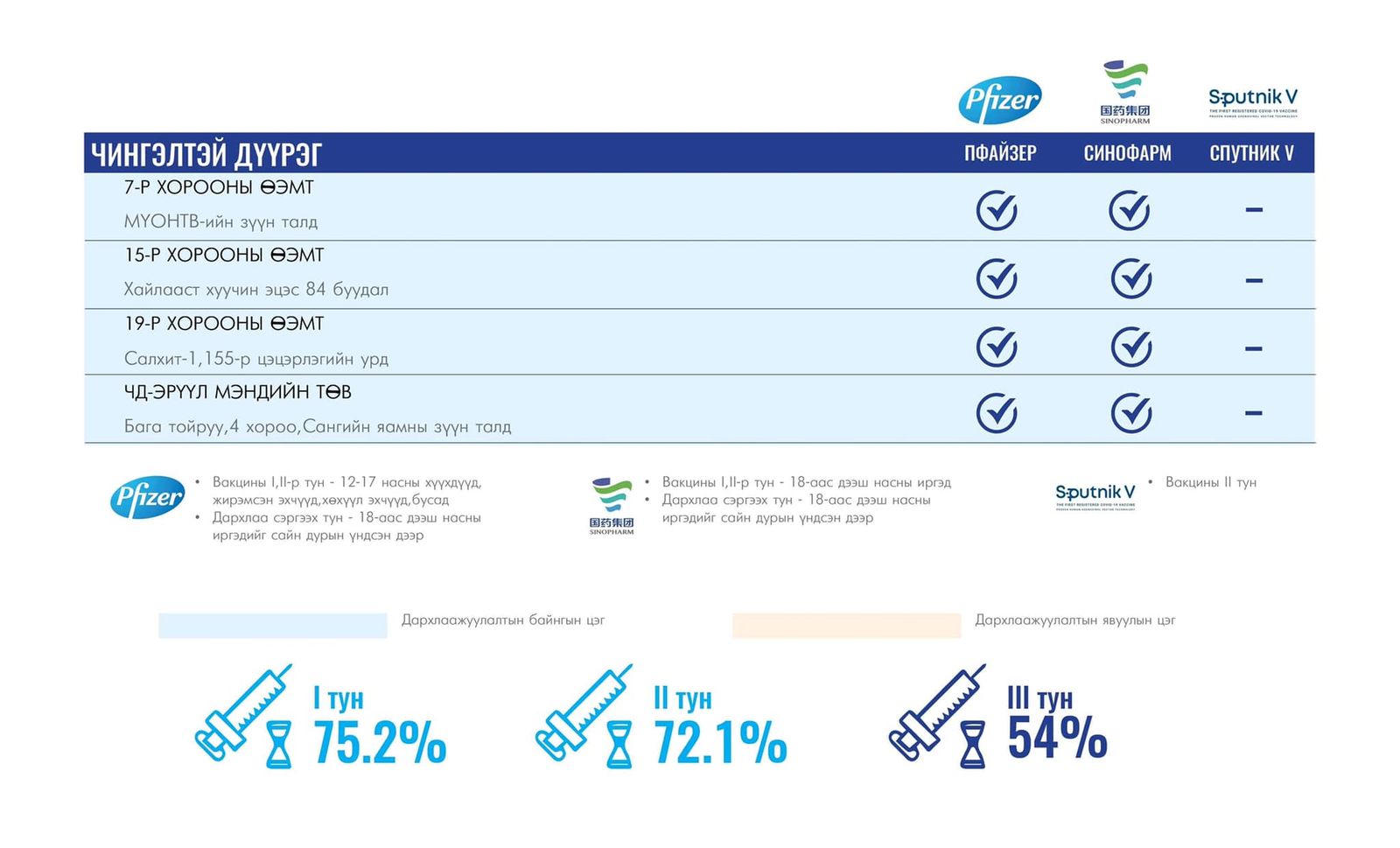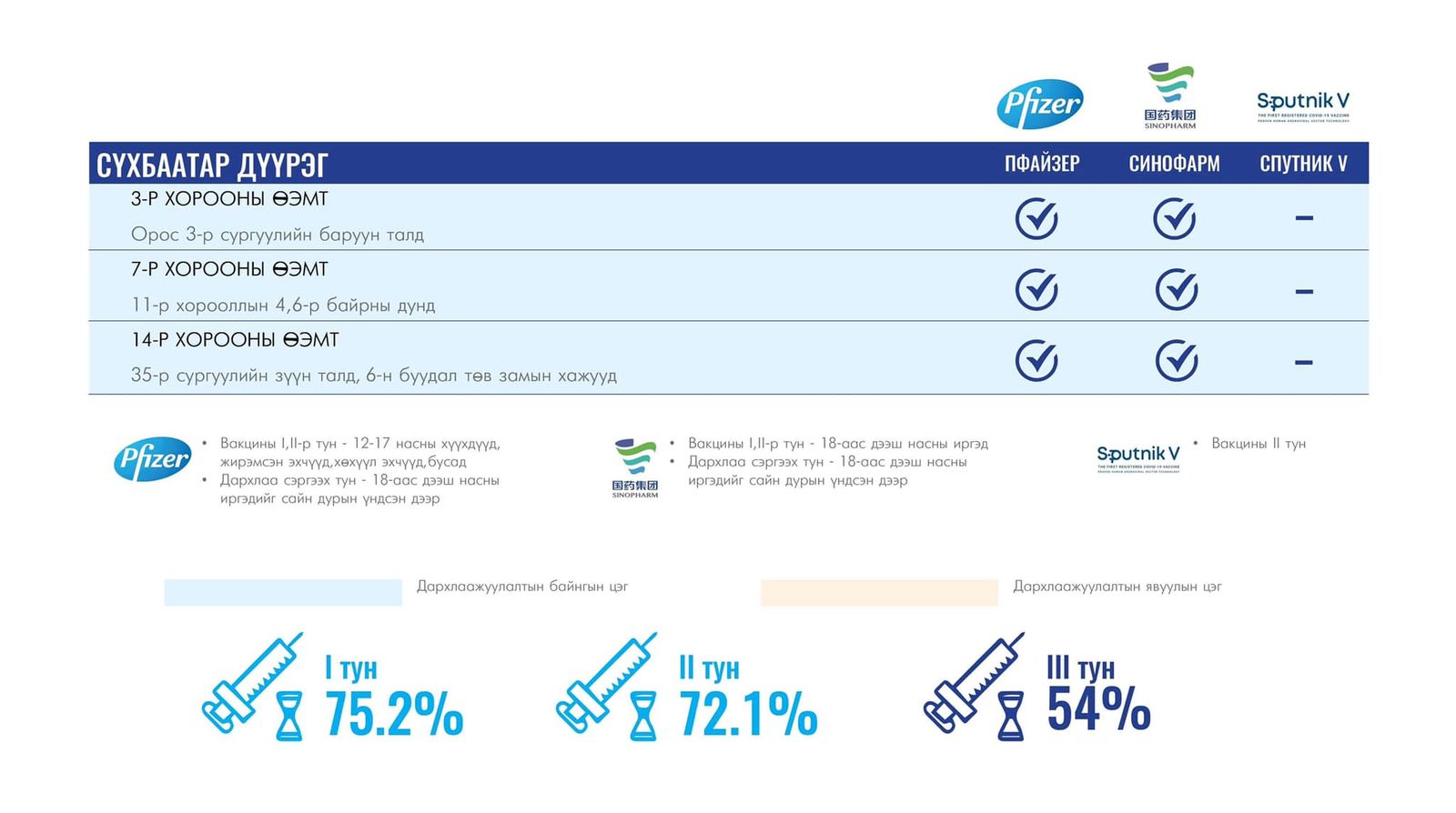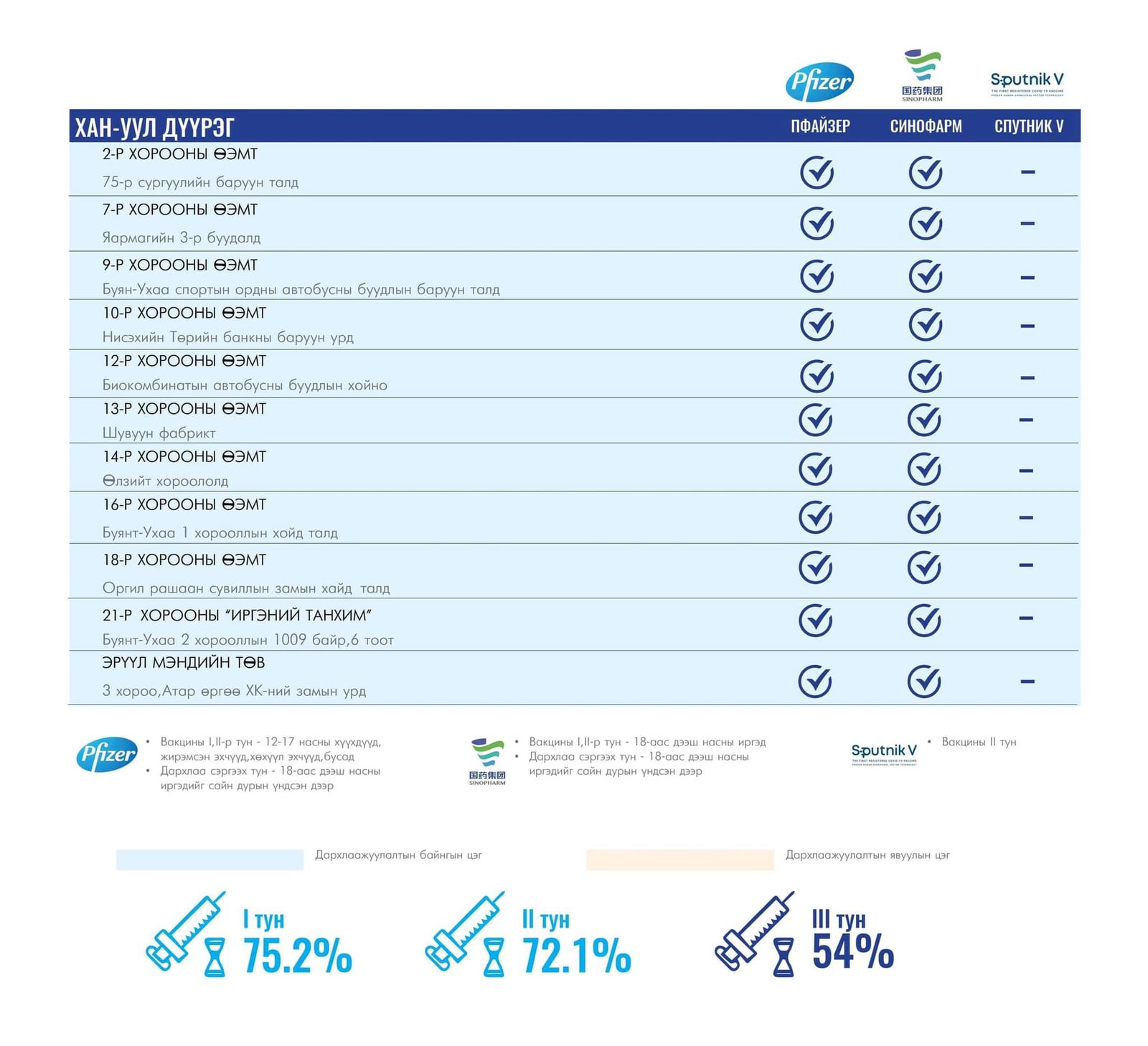 Вакцинжуулалт эхэлснээс хойш нийслэлийн зорилтот хүн амын I тунгийн хамралт 75.2 хувь, II тунгийн хамралт 72.1 хувь, III тунгийн хамралт 54 хувь, нэмэлт IV тунгийн хамрагдалт 6.8 хувь байна.