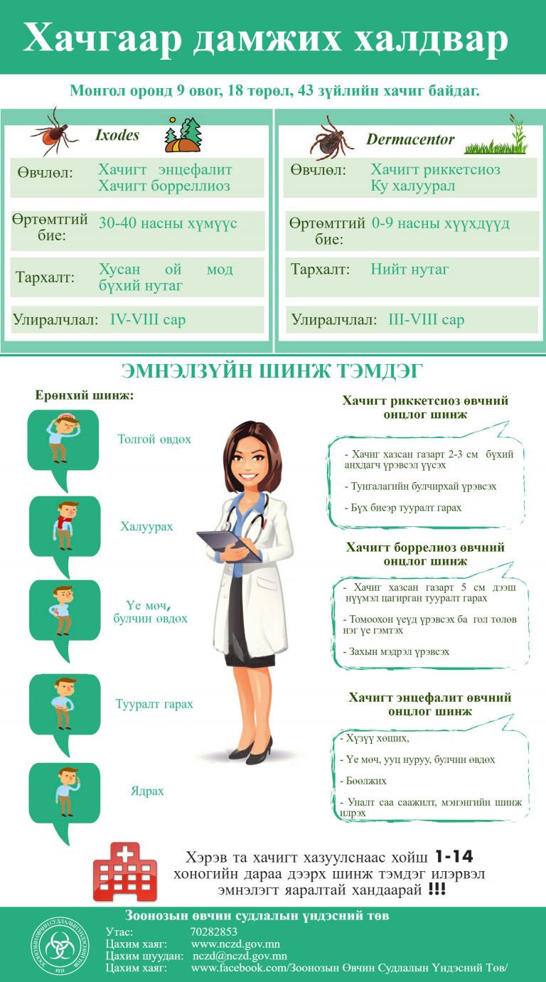 Манай оронд халдвар үүсгэгч олон зүйл байдгаас гол дамжуулагч нь ойн хачиг юм. Хачиг нь хүн, мал амьтны цусыг шимэгчлэн амьдардаг бөгөөд хүний биеийн нимгэн арьстай чийглэг газар буюу суга цавь, хөхний дор, чихний ар, үсэн дотор байрлаж бие рүү гүн шигдэн орж, вирус, нян зэрэг халдвар үүсгэдэг. Хачигт хазуулснаар олон төрлийн хүндрэл үүсэх эрсдэлтэй. Халдвартай хачигт хазуулах, хачгийг няцлах үед цусаар нь халдвар дамждаг байна. Хазуулаад удвал үхэлд хүргэх ч аюултай бөгөөд олон төрлийн хүндрэл үүсгэх эрсдэлтэй.