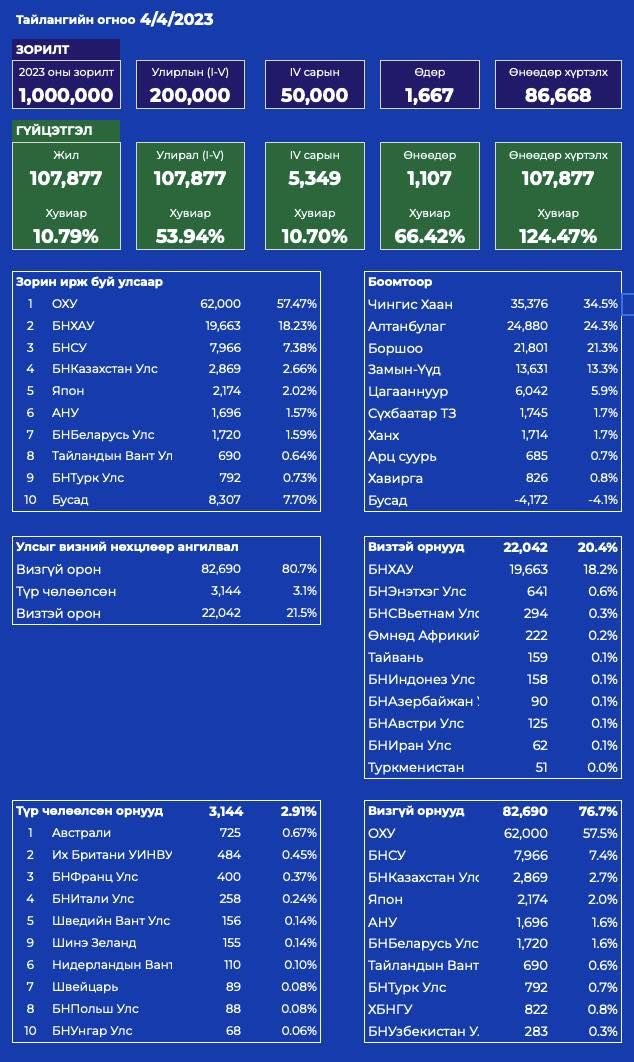 2023 оны дөрөвдүгээр сарын 4-ний байдлаар Монгол Улсад 107,877 жуулчин иржээ.