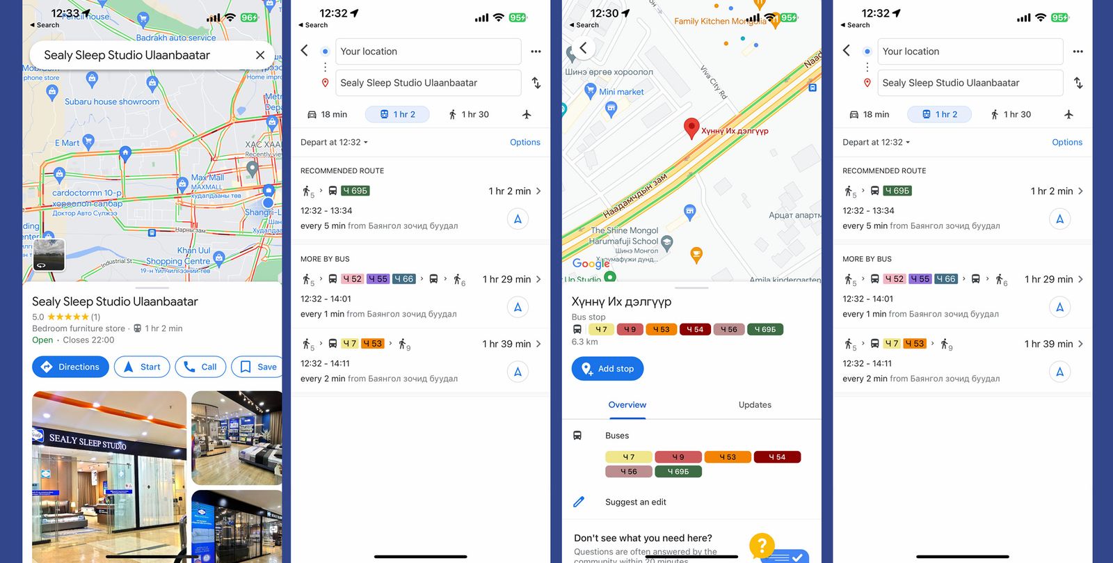 “Google maps” аппликэйшн дээр хүрэх газрынхаа байршлыг оруулж, “Нийтийн тээвэр” хэсгийг сонгосноор ямар чиглэлийн автобусаар хүрч болохыг харуулахаас гадна, хаанаас сууж болох мэдээллийг давхар харуулна. Мөн автобусны буудал дээр дарж ямар ямар чиглэл энэ буудал дээр зогсдог талаарх мэдээллийг хараарай.