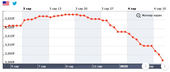 Тодруулбал, гуравдугаар сарын 17-нд ам.долларын эсрэг төгрөгийн албан ханш 3,528.05 төгрөгтэй тэнцэж байсан бол өнөөдрийг хүртэл суларсаар 3,501.68 төгрөгтэй тэнцэв.