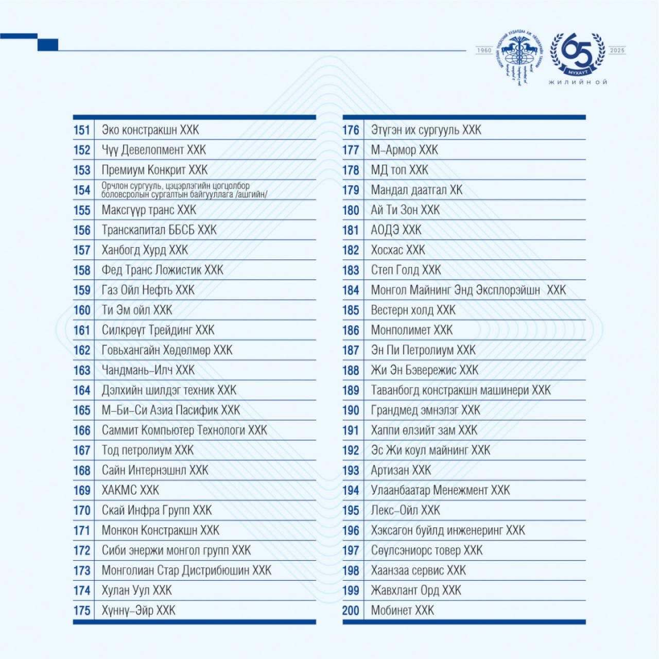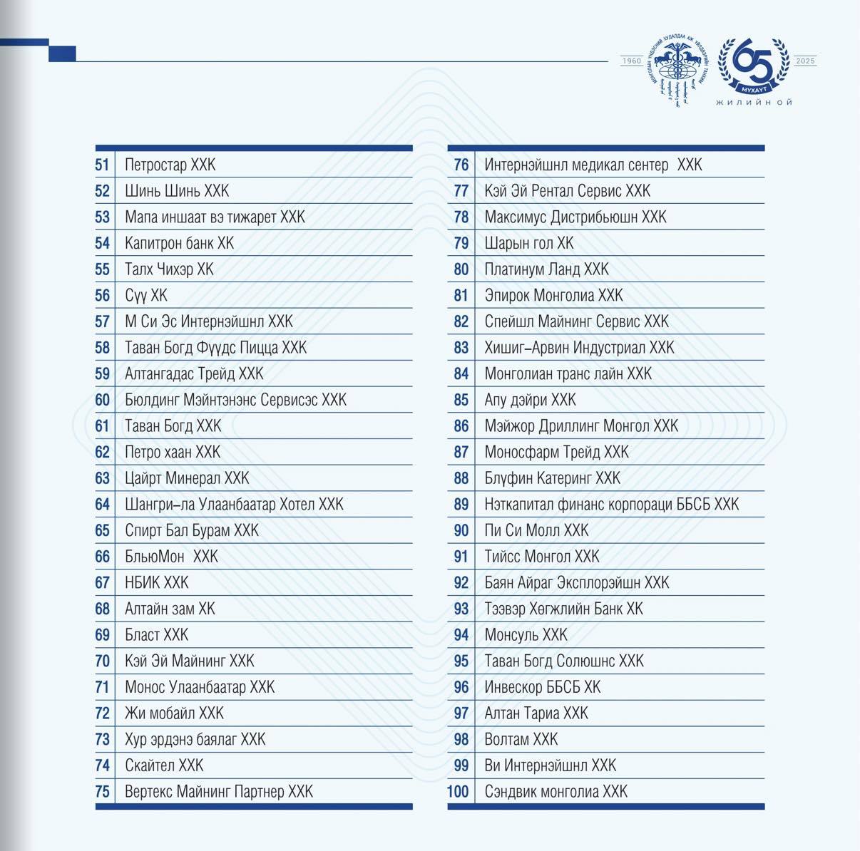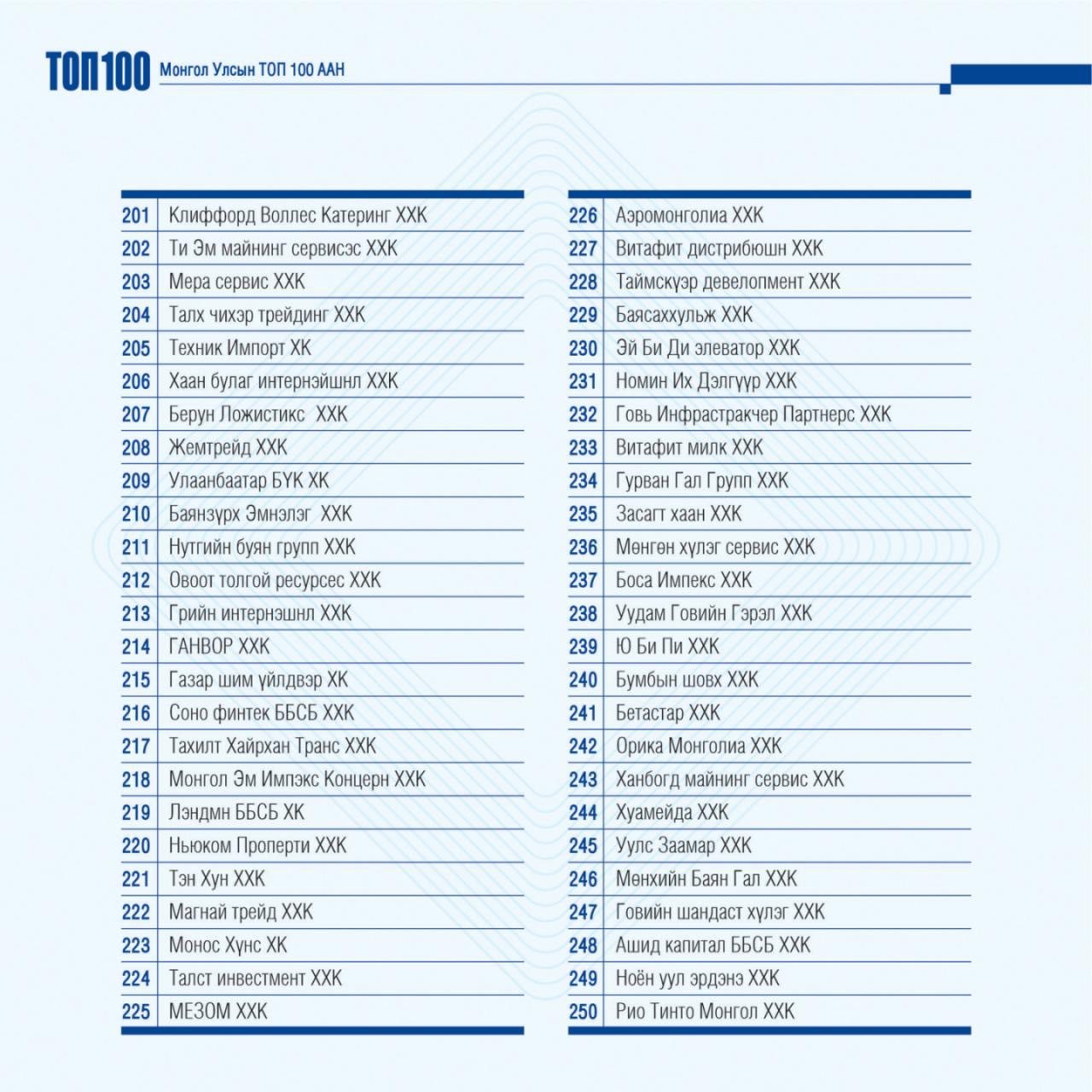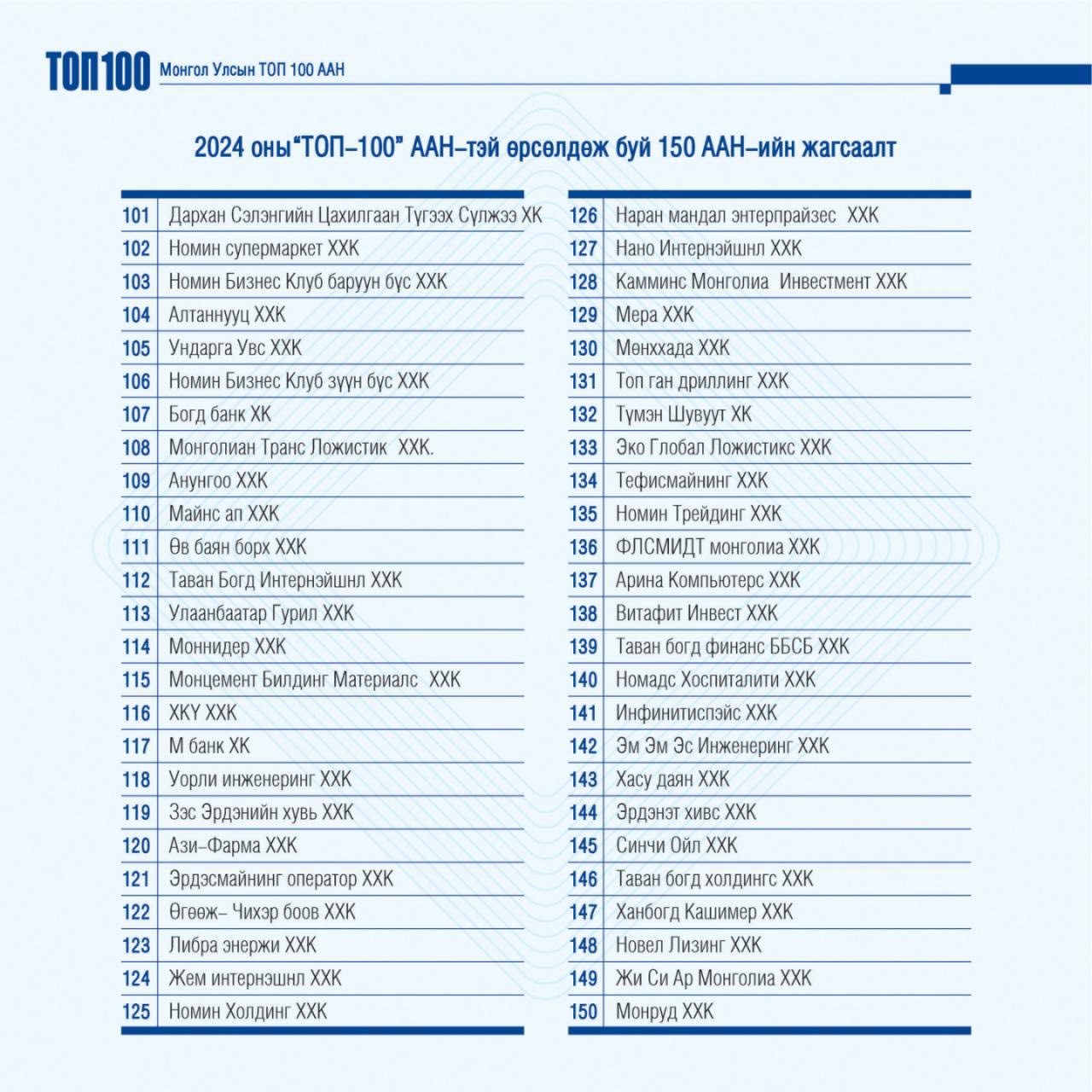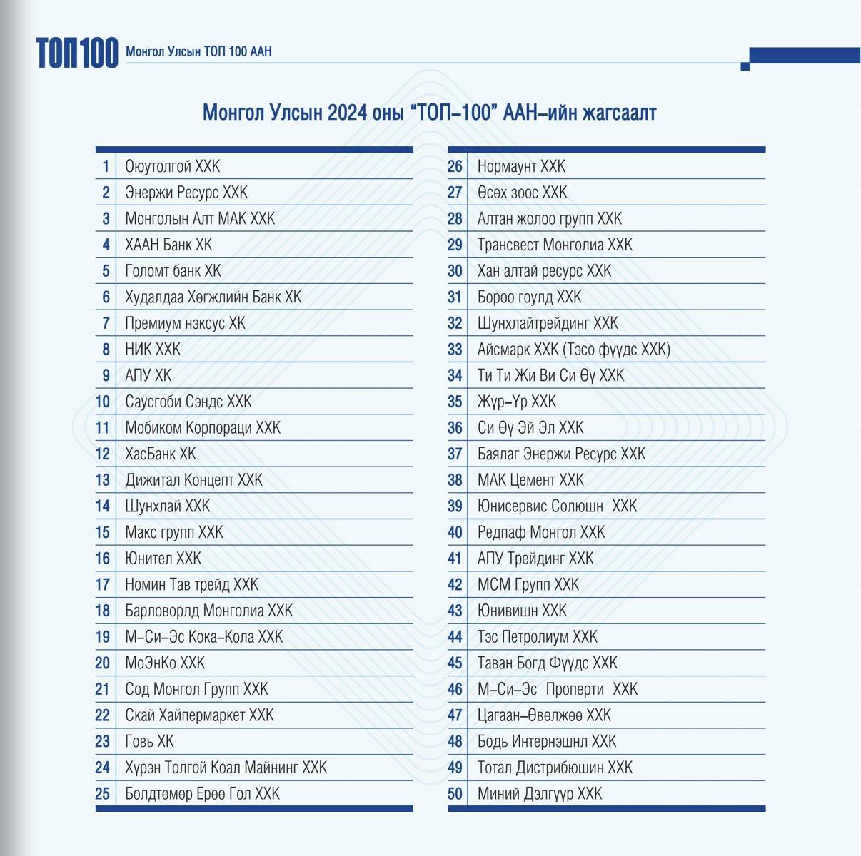 Шинэ жагсаалтыг уул уурхайн гурван компани тэргүүлж, тэдний араас гурван арилжааны банк оржээ. Салбарын хувьд: