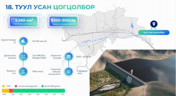 Улаанбаатар хотыг хөгжүүлэх 24 мега төслийн хүрээнд 5569 ам.метр талбайд Туул усан цогцолборыг 2025-2032 онд барина. Өнөөдрийн байдлаар нийслэлчүүд газрын гүний усыг 100 хувь хэрэглэдэг буюу хоногт 185-225 мянган метр.куб цэвэр ус хэрэглэж байна. 2040 он гэхэд хотын усны хэрэглээ хоногт 772,450 метр.куб болж өснө. Тиймээс Туул, Тэрэлж гол дээр урсац тохируулгын далан байгуулж, Туул усан цогцолборыг барьснаар гадаргын ус ашиглах боломж бүрдэх юм. Урьдчилсан байдлаар боомтын хөндлүүрийн 3-4 хувилбарыг сонгоод байна.